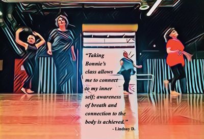 Taking Bonnie's dance class allows me to connect to my inner self; awareness of breath and connection to the body is achieved every single week through her guidance and instruction. When I am unable to take her class during the week, I suffer physically and emotionally. I find that I am sore and unable to connect to my body in the same way! It is truly transformative and I look forward to it each and every week! - Lindsay D.
